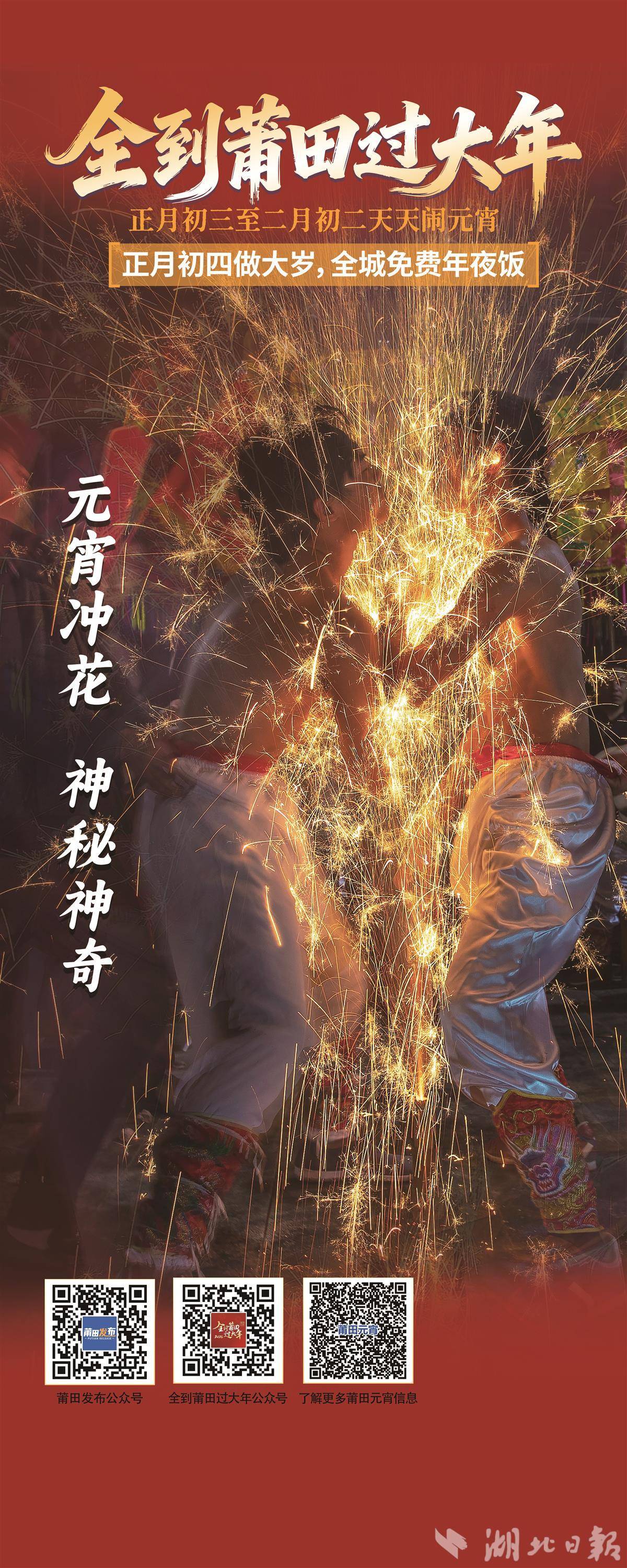 由460多年前抗倭历史演变形成的“正月初四做大岁”“贴白额春联”等独特年俗,让莆田的春节蕴含了更深沉的历史底蕴与人文温度。从农历正月初三至二月初二,莆田元宵持续一月欢腾,万斤红桔垒桔塔、全城免费年夜饭、万人游灯、打铁花、摆棕轿、爬刀梯、妈祖金身巡安布福等特色民俗活动轮番上演,天天有节目、家家齐上阵,精彩纷呈。