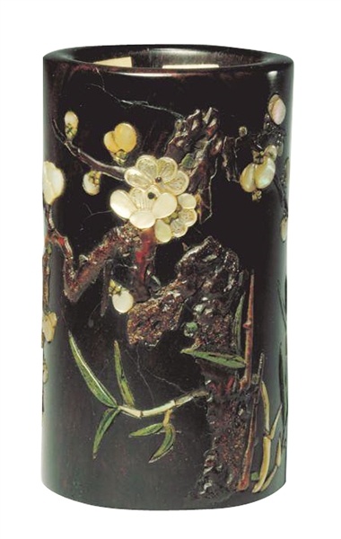 清代紫檀嵌螺钿梅竹图笔筒(故宫博物院藏)