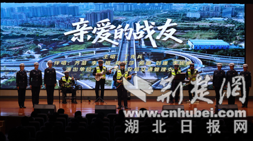 在 “警心向党 —— 永葆忠诚本色” 篇章中,钟祥市公安局民警带来情景讲述《追忆我们的战友 —— 吴建波》,通过深情回顾因公牺牲民警吴建波的生前事迹,以 “吴建波,到!”“我们都是吴建波” 的铿锵誓言,诠释英雄精神的传承。随后,荆门市公安局交管支队民辅警演唱原创歌曲《亲爱的战友》,质朴曲调中满含对日常执勤、风雨守护的深情,将民辅警在烈日与寒风中坚守岗位的画面生动呈现,让现场观众深刻感受公安队伍的奉献精神。