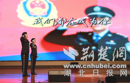 “实干担当 —— 筑牢平安基石” 篇章聚焦警民协同与基层治理实效。京山市公安局民警与 “承枫义警” 队员共同带来诗朗诵《温暖的答卷》,以警民联动守护平安的真实案例为素材,展现 “共建共治共享” 的社会治理新格局;东宝区龙泉街道塔影社区党委书记朱晓蓓、党委副书记杨媛媛与社区民警段维玮组成的 “三朵金花”,通过访谈《“三朵金花” 守塔影》分享 435 天反诈 “零发案” 的经验 —— 她们以 “扫楼敲门” 的细致工作筑牢反诈防火墙,用坚持与真诚赢得群众信赖;沙洋县公安局的快板表演《竹板铿锵续 “长安”》节奏明快、语言鲜活,生动展现基层民警在创新社会治理、化解矛盾纠纷中的智慧与活力。此外,望兵石学校 “少年警校” 学生演唱的《和你一样》,以纯净童声传递对人民警察的崇敬,象征平安梦想的代代延续。