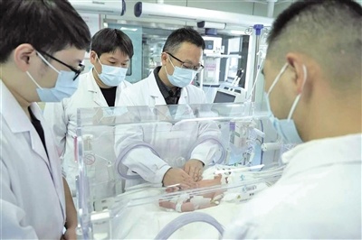 仙桃市妇幼保健院新生儿科主任肖毅华(右二)带领团队查看宝宝恢复情况 受访者供图