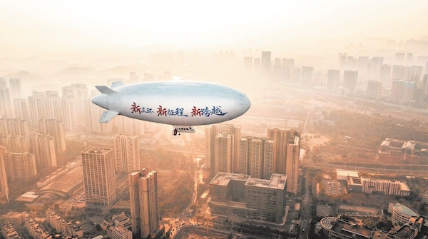 1月9日,伴随着冬日的晨光,“湖北造”载人飞艇祥云AS700完成荆门至武汉往返航程,期间还在武汉上空逛了一圈,实现了全国首次载人飞艇商业飞行。飞艇艇身总长50米,最大载客量9人,可广泛用于旅游观光、空中广告、应急救援等多个场景。楚天都市报极目新闻记者高伟 通讯员蒋子龙摄