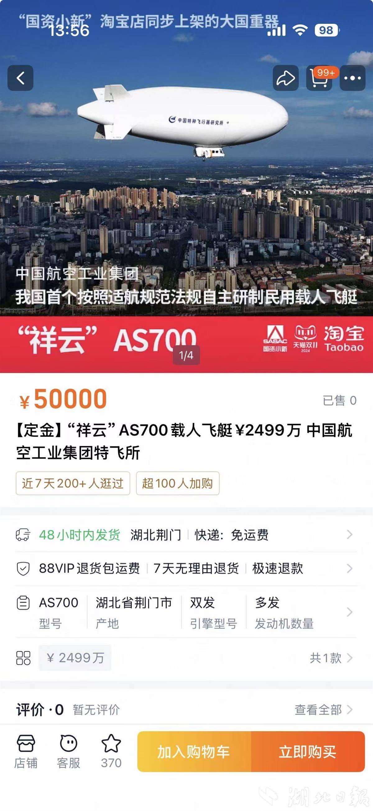 答:中国航空工业集团在淘宝上开了企业网店销售祥云AS700,标价2499万元/架。因售价较高,基本上以线下售卖为主。目前祥云AS700目前已累计签约售出42架,在贵州关岭、浙江绍兴、江苏太仓、广西阳朔等多地都有创新应用案例。买方多以政府单位、国企为主,主要用于观光旅游、空中广告等场景。相关单位购买祥云AS700后,需要配备专业飞行员,取得商业运营资质及空域使用资质后才能从事商业运营,不建议普通消费者购买。
