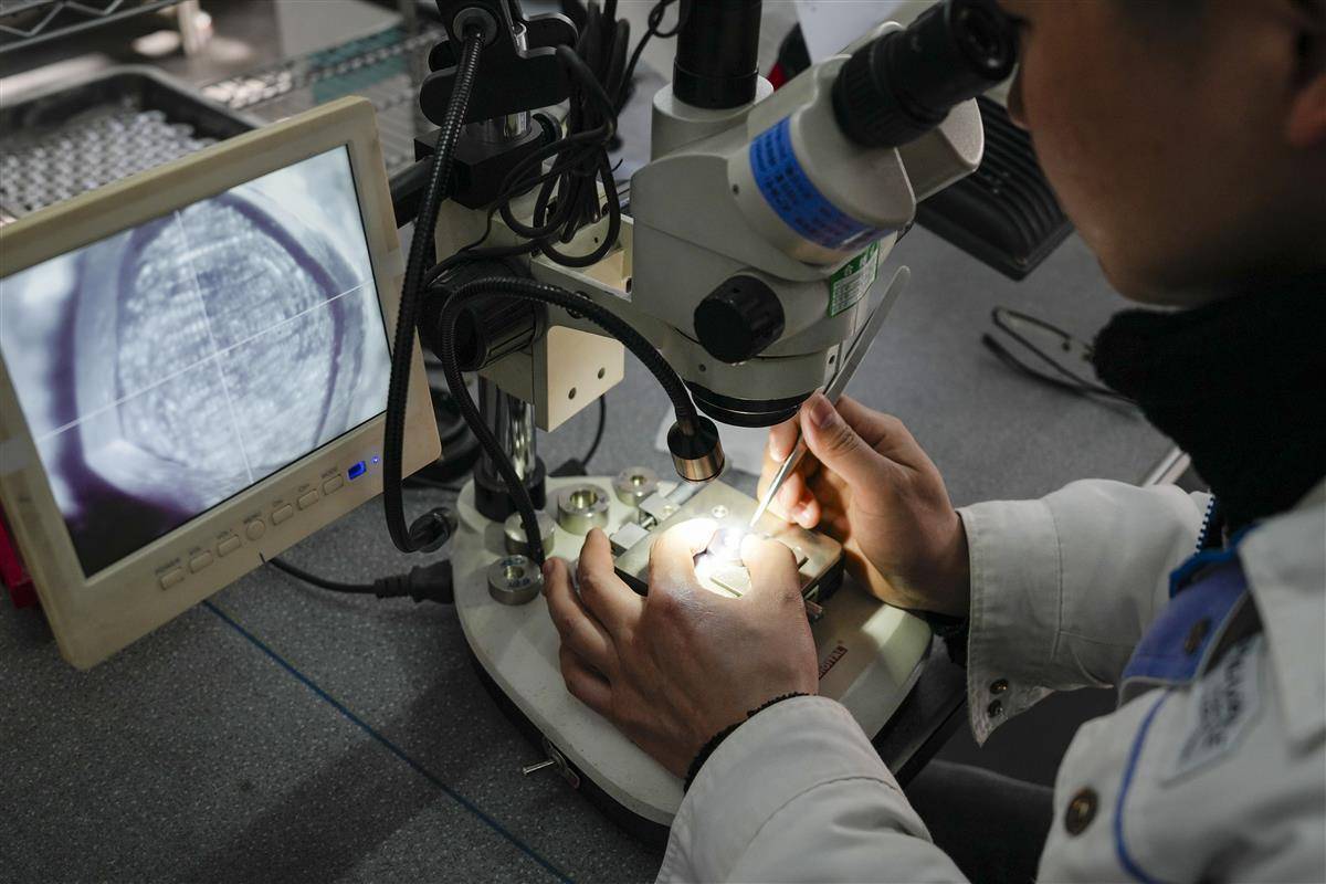 公司生产车间里,一颗颗人造单晶金刚石经过分拣、镶套、烧结、车削、打孔、抛光、定径等系列工艺后,变成大小不一的超高精度拉丝模具。