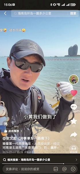安文龙今年28岁,是一名资深徒步爱好者。2017年开始,他利用业余时间徒步穿越了多条经典线路,包括乌孙古道、狼塔CV线、希夏邦马、尼泊尔珠峰EBC环线等。2025年,他决定挑战长距离骑行,并花费299元网购了一辆第一代共享单车——没有变速系统的小黄车。去年12月13日,他从西安出发,经陕西、河南、湖北、湖南、广东、香港、澳门抵达海南三亚,总行程约3500公里,用时29天。