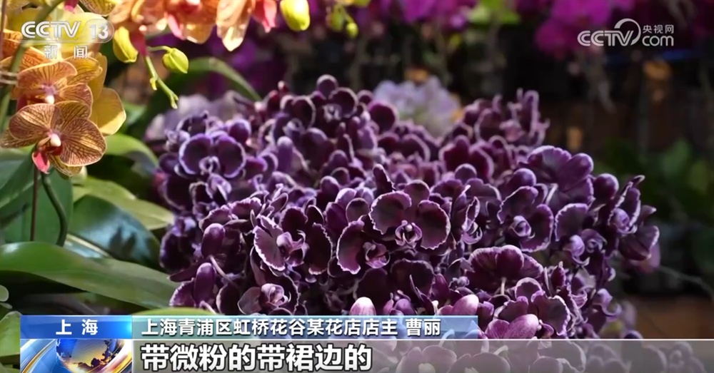 上海青浦区虹桥花谷某花店店主 曹丽:今年我们推出的拉丁舞裙、金色蜜桃、芳美传奇都是比较受欢迎的,像拉丁舞裙是黑的带微粉的裙边的,所以它比较有特点,像芳美传奇和金色蜜桃是复古粉。这两年年轻人买年花的也比较多,目前我们一天能卖一两百盆。