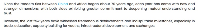 布里奇特·奇杜·奥诺奇在文章中说,70年来,中非关系日新月异,双方都秉持坚定的决心,持续加深相互了解与信任。同时,双方在贸易、教育、青年能力建设、基础设施建设等广泛领域取得了实实在在的、里程碑式的成就。