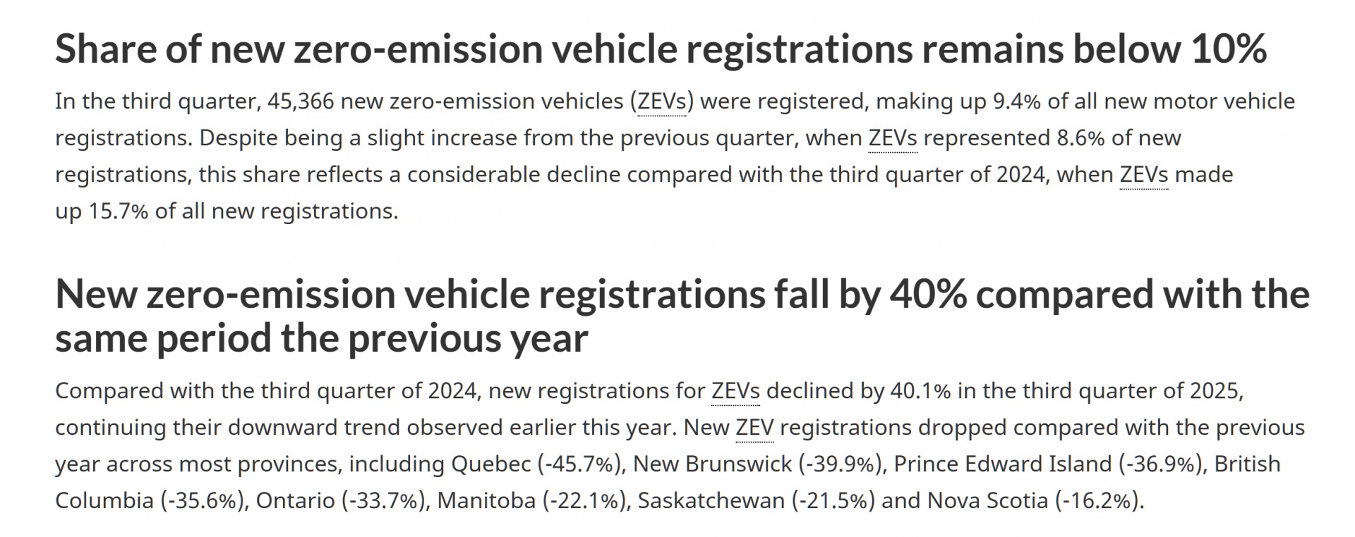加拿大统计局2025年12月发布的数据显示,当年第三季度,加拿大新注册零排放车辆(ZEV,含纯电、插电混动、氢能电动汽车,不含油电混动)份额低于10%。
