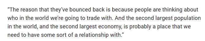 人们都在思考我们应该和世界上的哪些国家进行贸易。(中国)作为世界第二大经济体,正是加拿大需要与之建立某种关系的原因所在。”