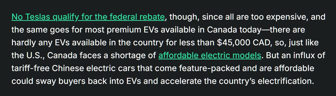特斯拉价格过高,所有车型都无法享受加拿大联邦政府的补贴。目前加拿大市场几乎没有售价低于4.5万加元的电动汽车。和美国一样,加拿大也面临着物美价廉的电动汽车产品短缺问题。但是,如果配置丰富、价格实惠的中国电动汽车能够免税进入,将会重新吸引消费者购买电动汽车,并加速加拿大的电气化进程。”