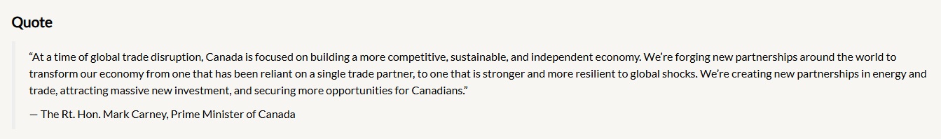 在全球贸易动荡之际,加拿大致力于打造更具竞争力、更可持续、更独立的经济体。我们正在世界各地建立新的伙伴关系,以改变对单一贸易对象的依赖,成为更强大、更能抵御全球冲击的经济体。我们正在能源和贸易领域建立新的伙伴关系,吸引大量新投资,并为加拿大人创造更多机会。”