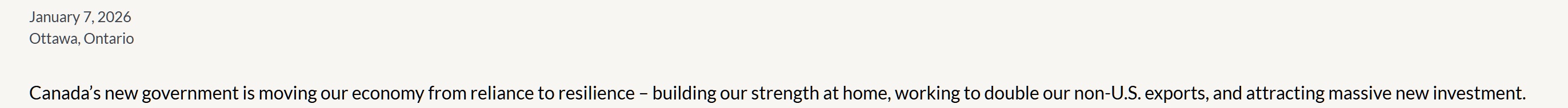 加拿大新政府正在推动本国经济从依赖走向韧性——增强国内实力,努力使对美国以外的出口增长一倍,并吸引大量新投资。”
