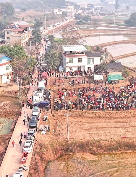 1月12日,流水席继续,仍有大量网友闻讯赶到合川区云门街道庆福村的“呆呆”家。记者注意到,一些网友驱车带着猪上路,他们表示,“呆呆”家的猪可能不够吃,愿意献出自家的猪来招待网友。
