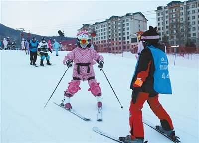 黑龙江哈尔滨亚布力滑雪旅游度假区内的滑雪爱好者。