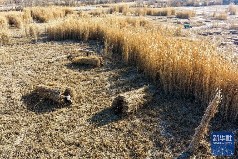 ↑ 在新疆和田地区墨玉县扎瓦镇,当地农民在收割芦苇(1月10日摄,无人机照片)。