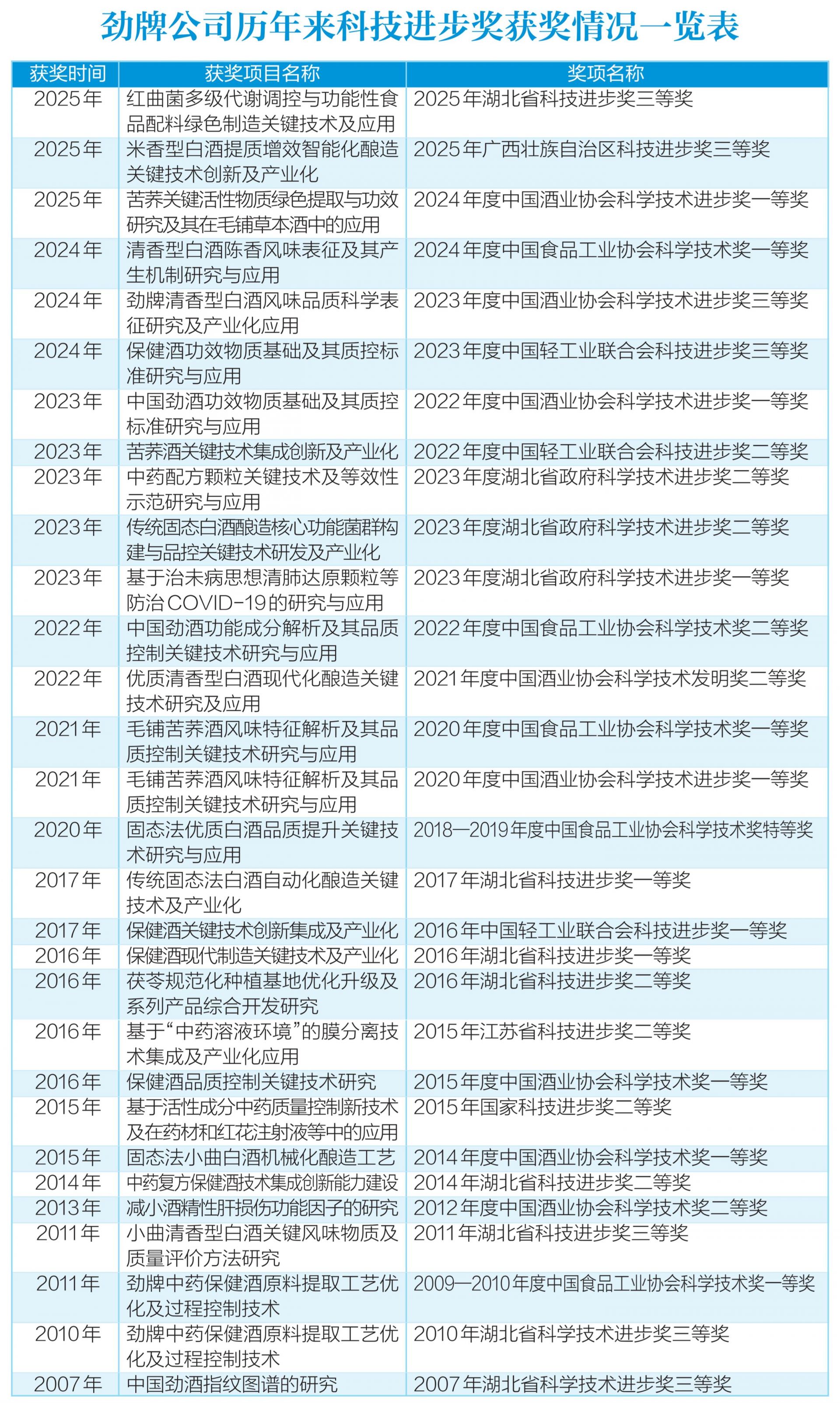 2025年,“劲牌养生一号、参茸劲酒、追风八珍酒”三款产品凭借其品质和风味特点,入选《全国特色风味食品标志性产品、制作技艺传承人名录》,获得国家层面认可。