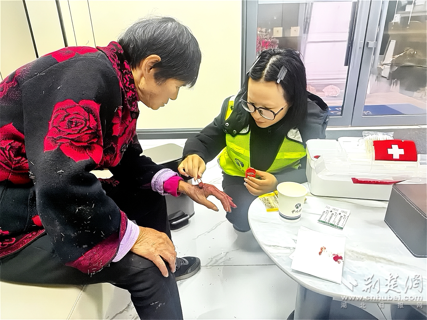情况紧急,工作人员第一时间将老人搀扶至站内“爱心小屋”,先为老人递上热水驱寒,随后从应急药箱内取出碘伏,细致为老人清洗伤口、贴上创可贴,同时轻声安抚,缓解老人的紧张情绪。经耐心询问得知,老人原本打算前往县城医院照顾病重老伴,因身无分文便步行前往,途中误入高速,不慎摔伤后彻底迷失方向。