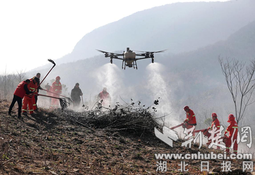 荆门市首支植保无人机应急救援队在石桥驿镇开展灭火实战应用。赵平 摄