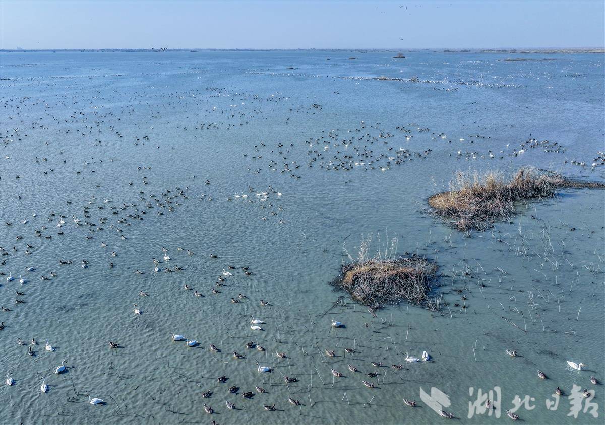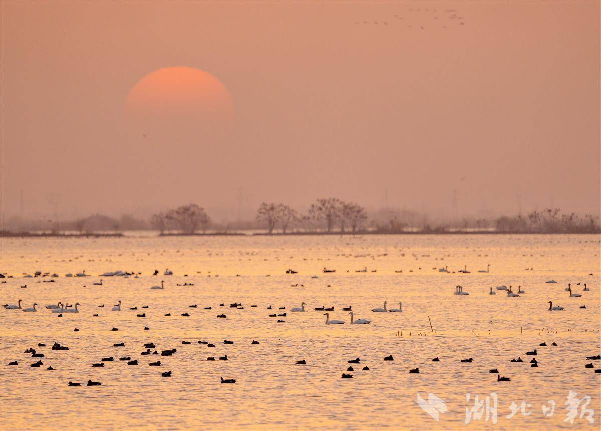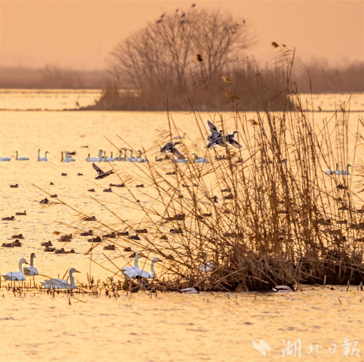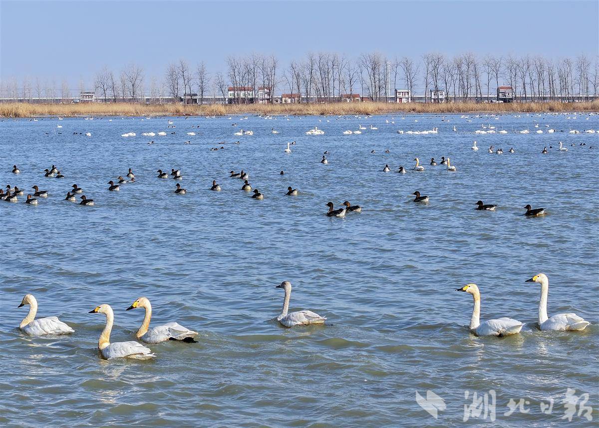 汈汊湖是全国最大的内陆型封闭式湖泊,与汉江相连。近年来,当地实施退垸还湖、水系连通等六大工程,湖泊面积恢复至48.7平方公里,水质稳定在Ⅲ类标准。良好的生态环境让大量候鸟飞抵汈汊湖栖息越冬,最高峰时数量超过10万只,越冬水鸟种类已达100多种。(视界网 晏美华 摄)