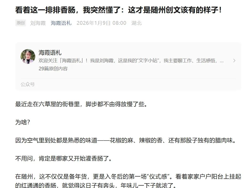 “看着这一排排香肠,我突然懂了:这才是随州创文该有的样子!”近日,一篇由随州六草屋社区居民“海霞”撰写的微信公众号文章在当地朋友圈悄然走红。文章没有空洞的口号,而是从冬日街头巷尾那熟悉的“香肠味”切入,以小见大,引发了众多市民对 “什么是创文” 的共鸣与思考。