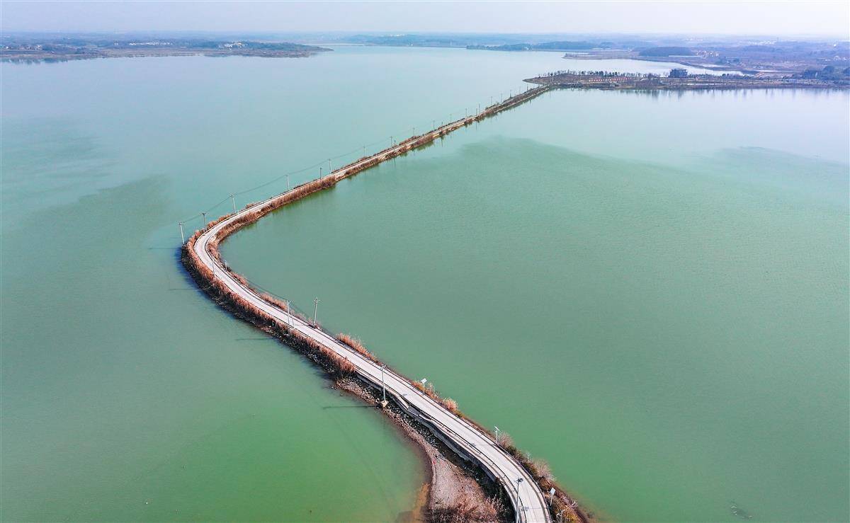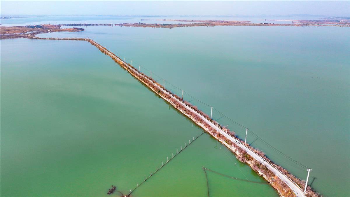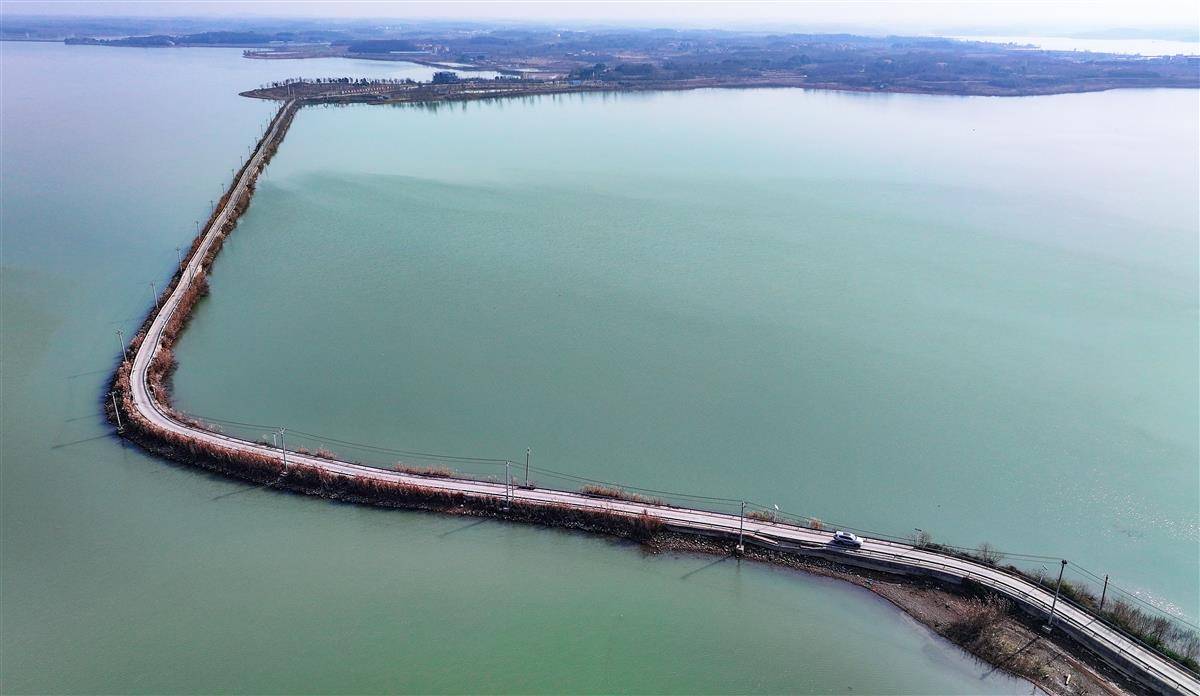 1月12日,鸟瞰武汉江夏区鲁湖中的道路,这条无名小路被骑行人称为鲁湖水上公路。