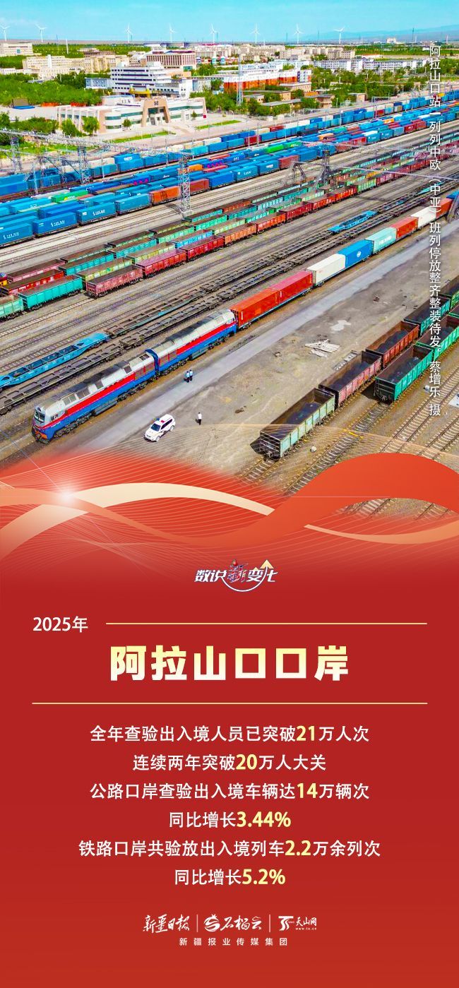 过去一年,新疆口岸经济活力十足,自信新疆也在开放中得到了最直接、最有力的印证。霍尔果斯、阿拉山口、吉木乃、塔克什肯……这些口岸如同镶嵌在祖国西北边陲的璀璨明珠,在共建“一带一路”宏伟蓝图中,焕发出前所未有的生机。2025年,新疆口岸实现了哪些新突破?取得了怎样的亮眼成绩?今天的《数说“新”变化》一起来看看。