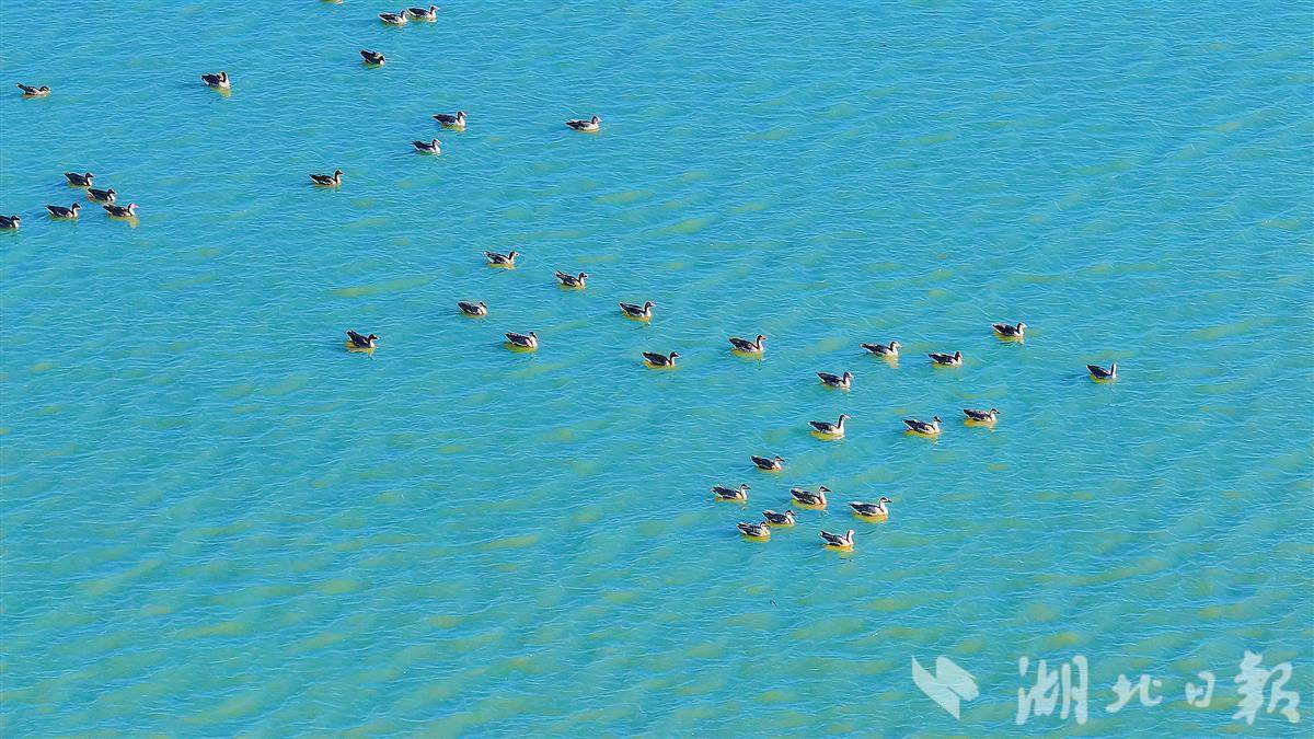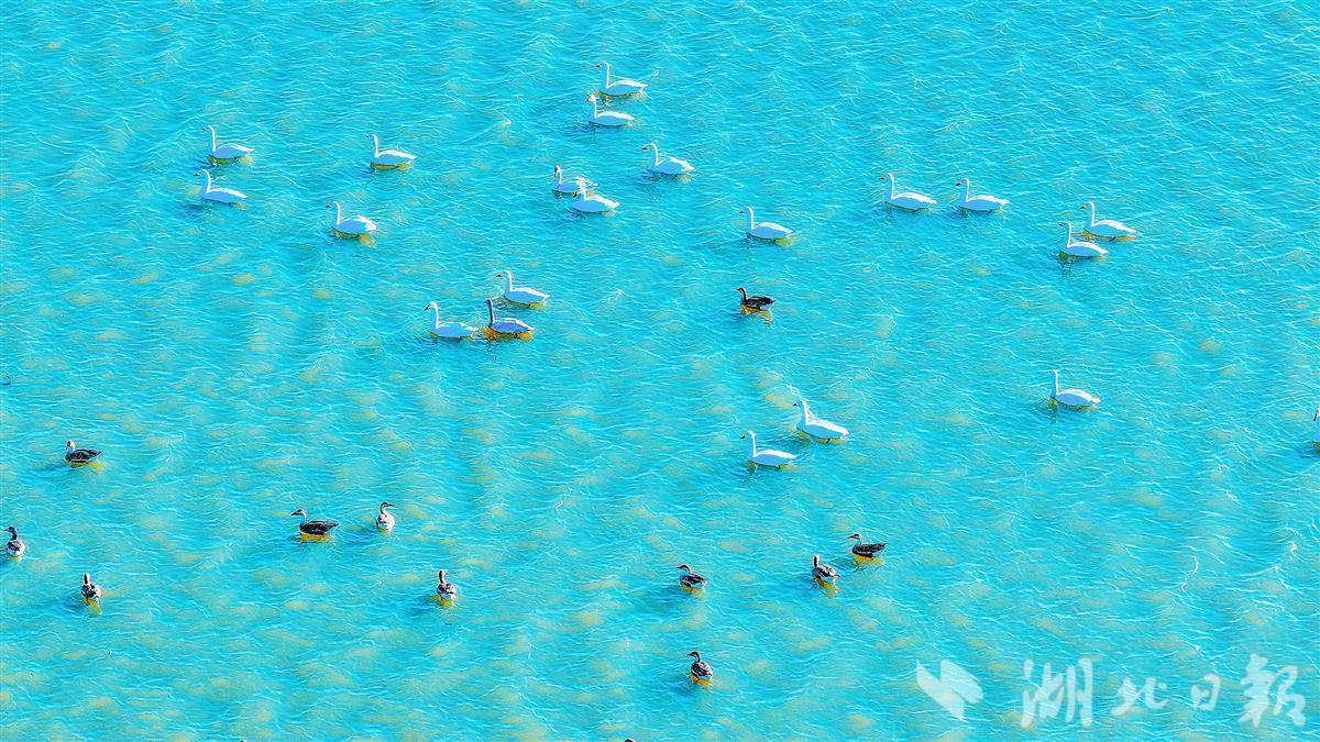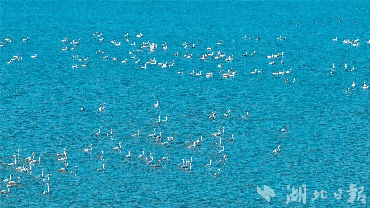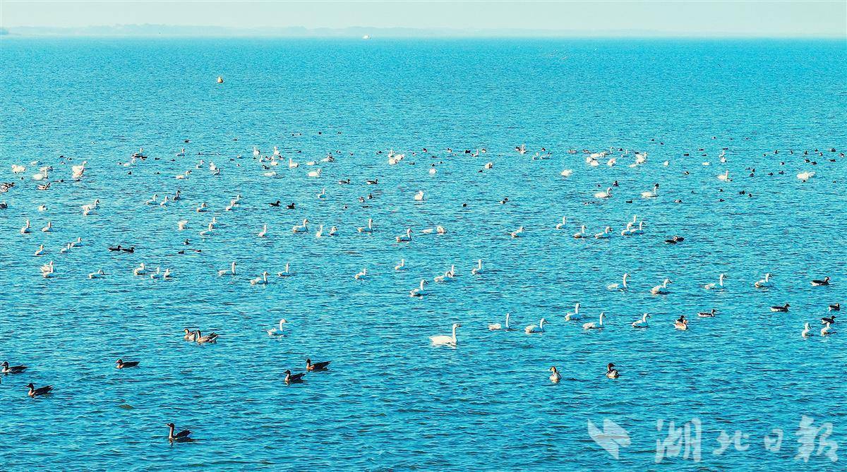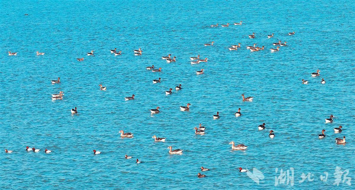 1月12日,在鄂州梁子湖上,成群的候鸟时而嬉戏,时而觅食,清澈的湖面热闹非凡。