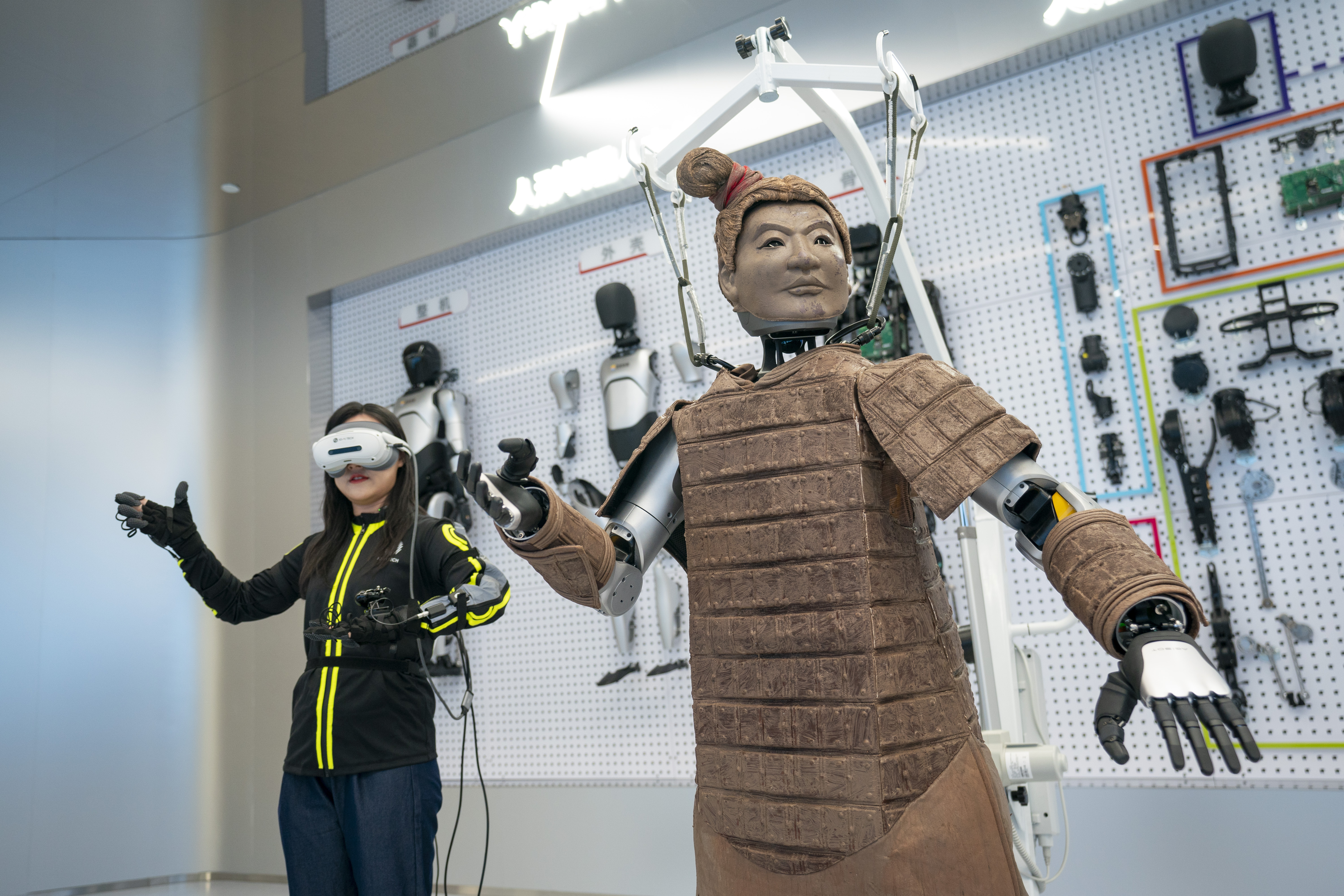 湖北人形机器人中心,人形机器人跟着动捕演员训练舞蹈动作。(湖北日报全媒记者 魏铼 摄)