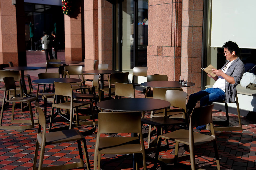 2025年11月17日,一名男子在日本东京的一家咖啡店外休憩。新华社记者贾浩成摄