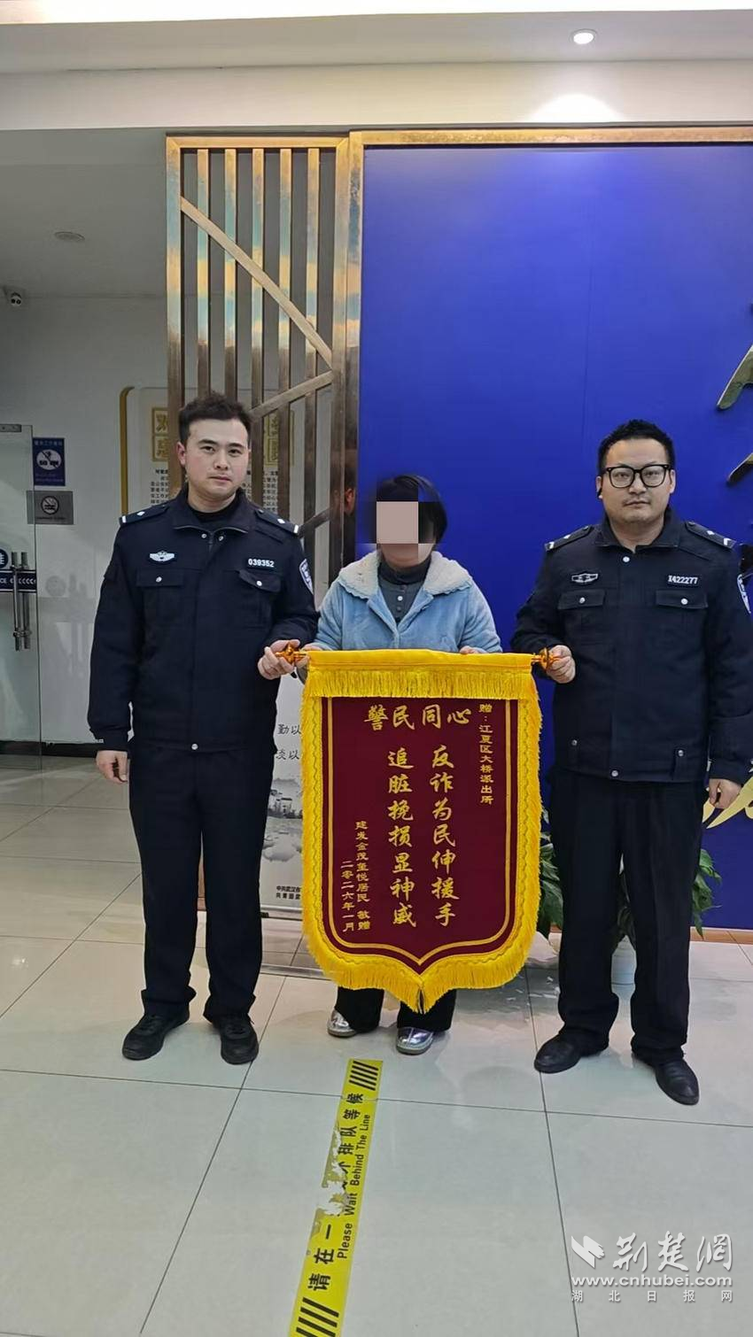 1月14日上午,收到10万元退款的翁女士专程来到大桥派出所,将一面印有“反诈为民伸援手,追赃挽损显神威”的锦旗送到民警程泽坤手中,连声道谢:“真没想到钱还能追回来,太感谢你们了!”她表示,民警不仅帮她挽回了经济损失,更在她最慌乱无措的时刻给予了坚定的支持和温暖。