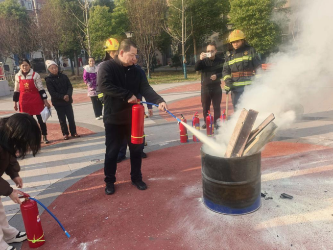 培训的重头戏是灭火器材的实际操作教学。消防宣传员现场讲解了干粉灭火器的构造、原理及日常检查方法,重点演示了“提、拔、握、压”四字使用口诀。在宣传员的专业指导和保护下,多名村民代表踊跃上前,亲身体验了灭火器的操作流程,成功完成了模拟火源的扑灭练习。“以前光知道有灭火器,但从来没用过,心里没底。今天亲手操作了一遍,终于明白了,万一遇到小火,自己也敢上了!”一位参与实操的大叔兴奋地表示。