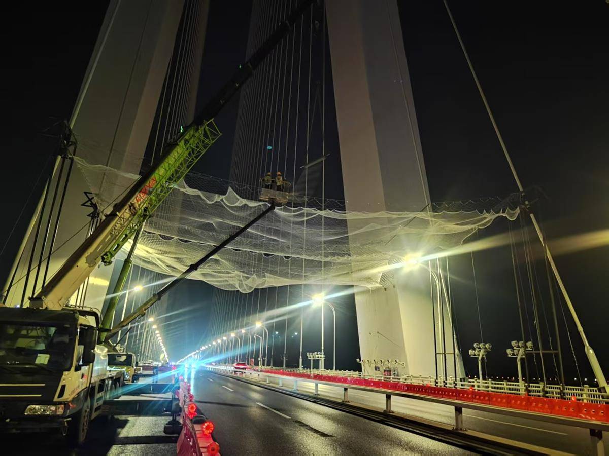 2025年8月,一辆车在桥上自燃,导致一根斜拉索局部受损。虽不影响大桥总体结构安全,但为彻底消除隐患、确保桥梁长期安全运营,还是需对受损部位进行更换处理。防护网作为施工期间的关键安全措施,可有效防止坠物风险,保障桥下车辆通行安全。