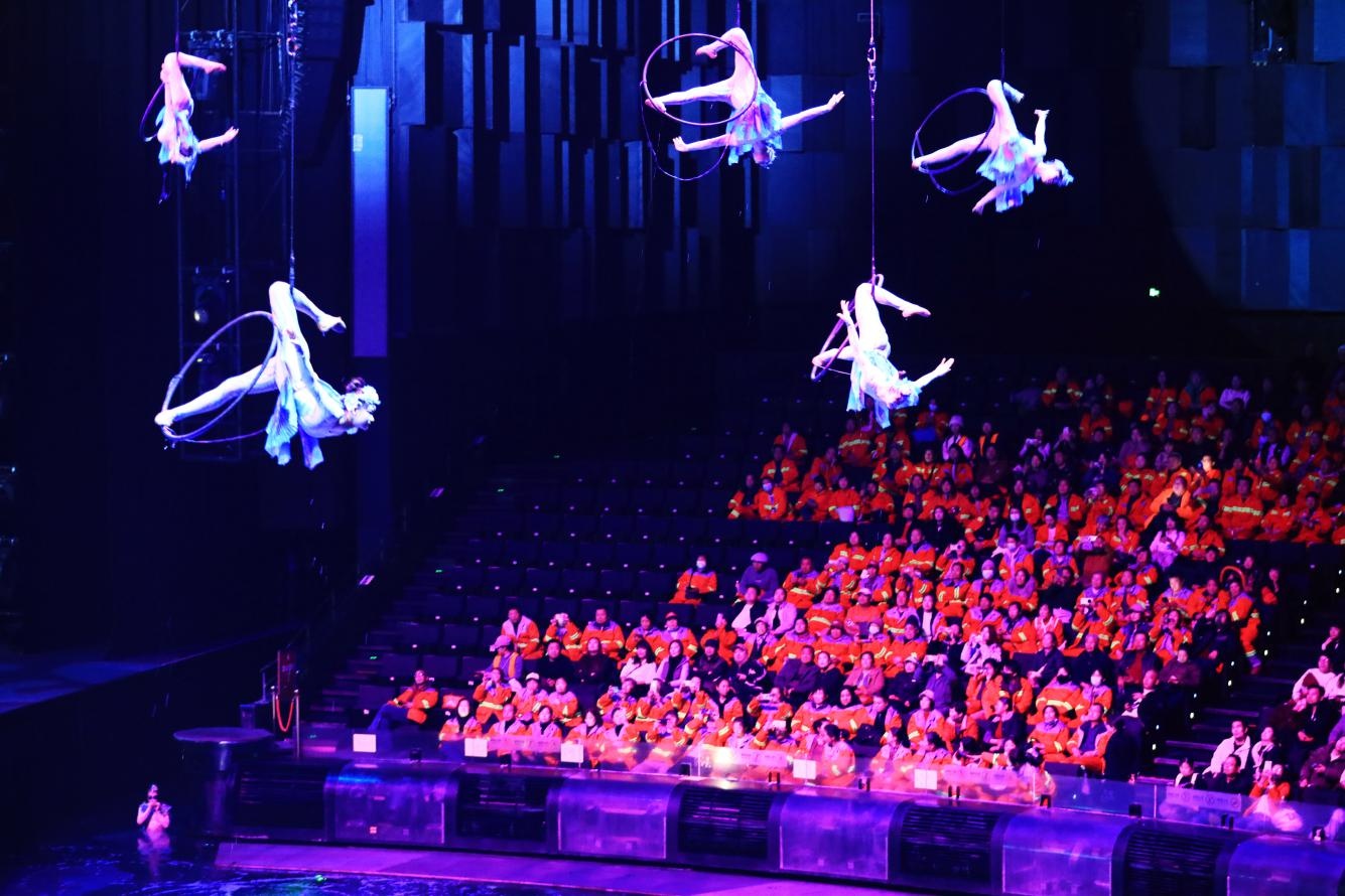 傍晚6点半,橙色身影陆续出现。晚7点半,灯光渐暗,音乐响起。舞台中央水幕升腾,光影流转间,演员们以特技演绎剧情。看台上,环卫工人们凝神观看,目光随剧情移动,不时报以热烈而持久的掌声。“这个节目让我们体验了一把紧张和刺激的感觉。”武昌区二桥清洁队司机班负责人范建华难掩兴奋。