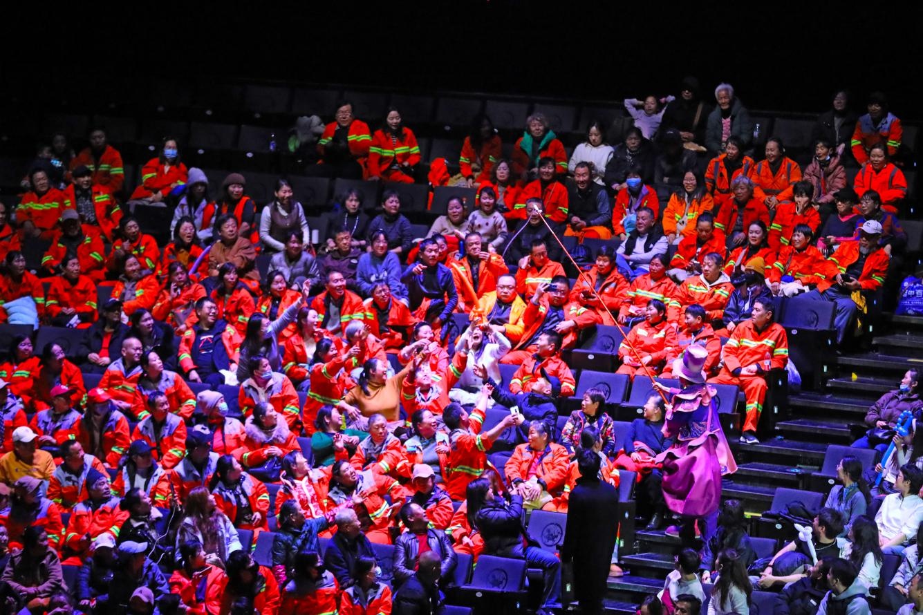 演员与环卫工人在看台上互动。(通讯员肖敏摄)