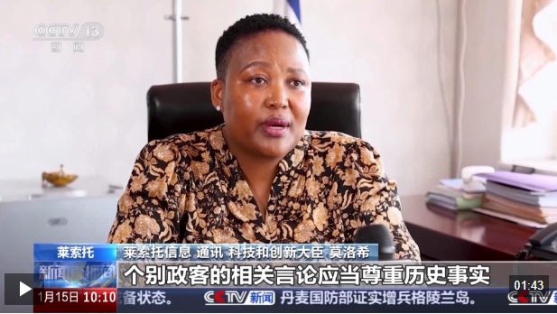 莱索托信息、通讯、科技和创新大臣 莫洛希:莱索托认为,个别政客的相关言论应当尊重历史事实,尊重国际关系的基本准则。莱索托在台湾问题上的立场一贯而明确,我们坚定奉行一个中国原则,承认世界上只有一个中国,台湾是中国的一部分。