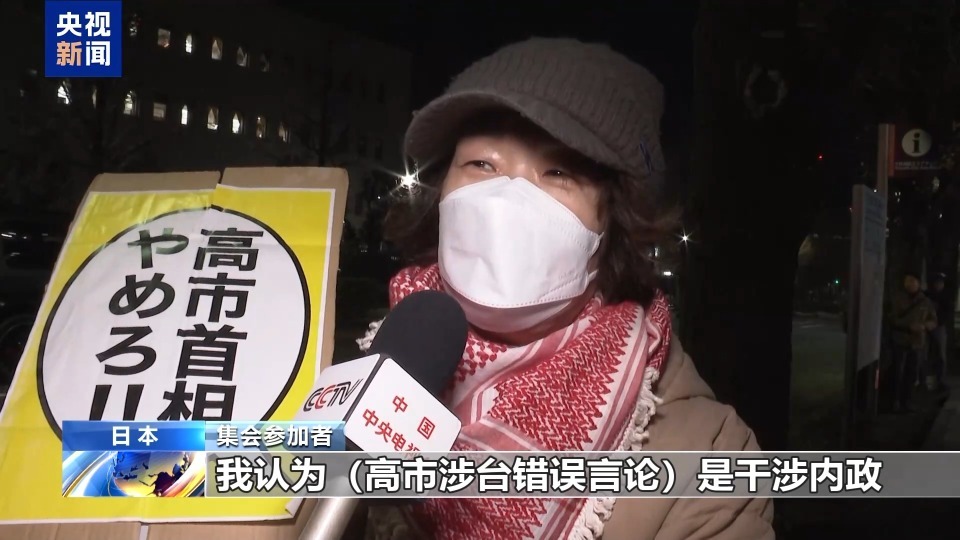 集会参加者:我认为高市涉台错误言论是干涉内政。中国以及东亚地区都有被日本侵略的历史,高市轻率地以个人的想法来发表这样的言论,我觉得是非常危险的,所以我真的希望高市下台。