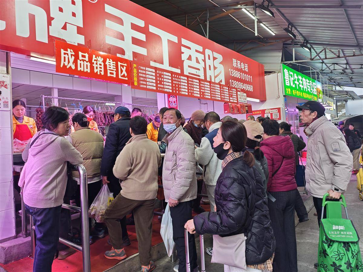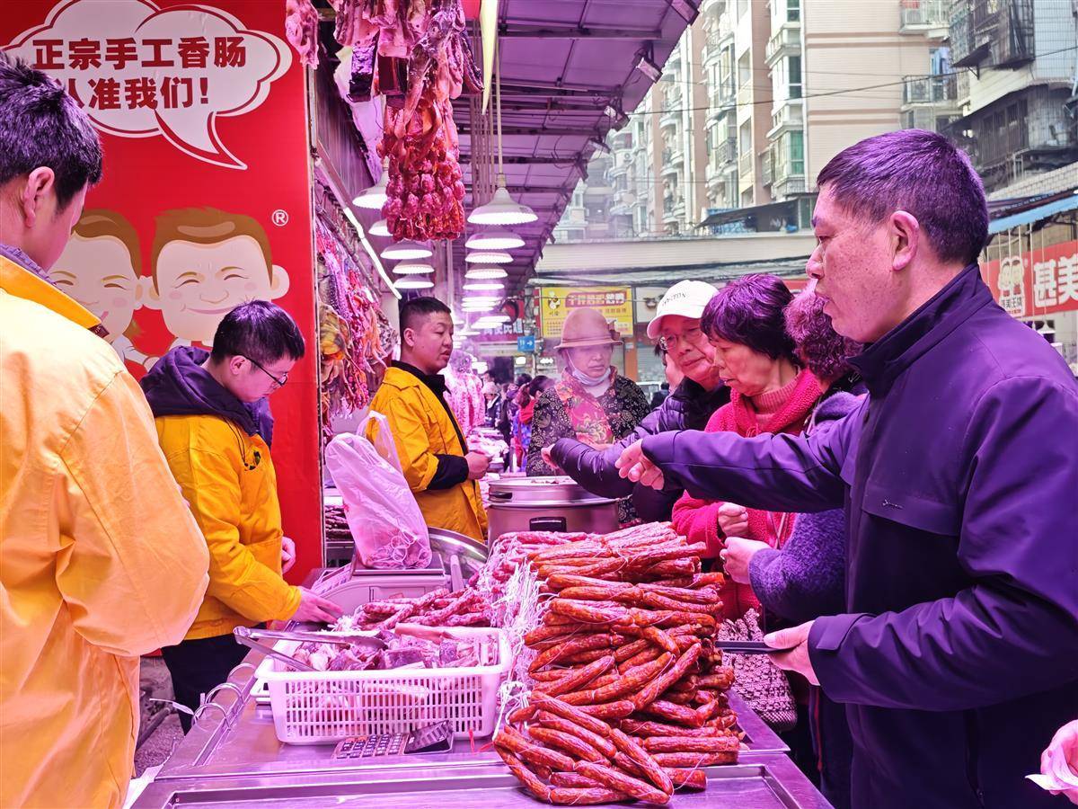 不远处,另一家“皇牌香肠”店铺里,老板魏先生正忙着接待顾客。他一边展示为快递设计的真空包装礼盒,一边介绍:“我们现在的制作流程很快,灌好料后大概二十分钟就能初步成型,一天下来能出货五千斤左右。”他说,当天早上就有一位中年女顾客专程赶来,一口气预订了三百斤麻辣味腊肠,要送给外地的朋友,安排快递发走。