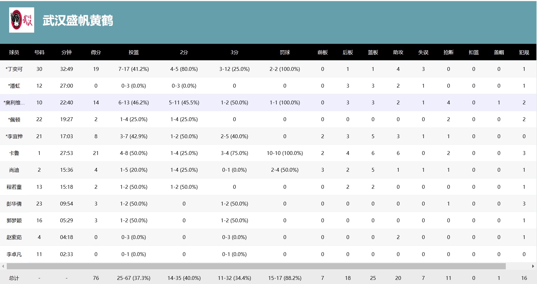 从球队数据更能明显看到武汉盛帆黄鹤队的奋力拼搏和战术得当。双方的篮板球对比是28比46,二次进攻对比是18比7,禁区得分是36比12,2分球命中率是61%比40%。很明显,这是一场在内线完全不对称的战斗,一般球队早就放弃了。但武汉盛帆黄鹤队利用努力奔跑和战术安排,抢断11次,逼得对手出现16次失误,自己只有7次。更有趣的是,山东队内两大中锋帕克和张子宇正负值分别是-9和-8,全队断崖最低,也充分说明武汉盛帆黄鹤在战术上对山东队的内线限制极大。