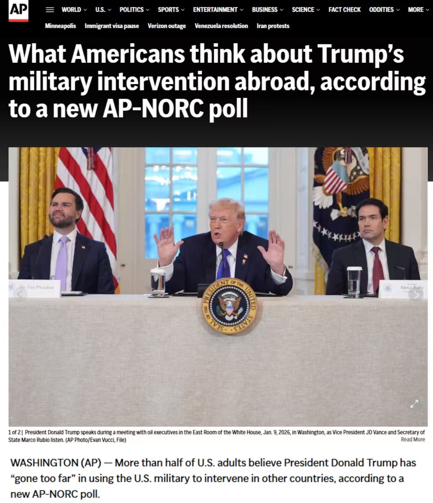 美联社近日刊文称,美联社-NORC公共事务研究中心最新民意调查显示,56%的美国成年人认为,美国政府在动用军队干预他国的问题上“太过火”,同时多数人对美国政府的整体外交政策及在委内瑞拉问题上的处理方式持否定态度。