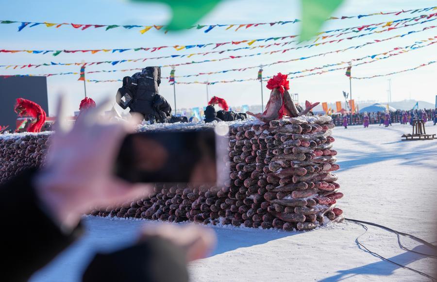 This photo taken on Jan. 8, 2026 shows a tourist taking a photo of a wall made of fish during the opening ceremony of the 24th Chagan Lake Ice and Snow Fishing and Hunting Cultural Tourism Festival in Songyuan, northeast China's Jilin Province. (Xinhua/Yan Linyun)