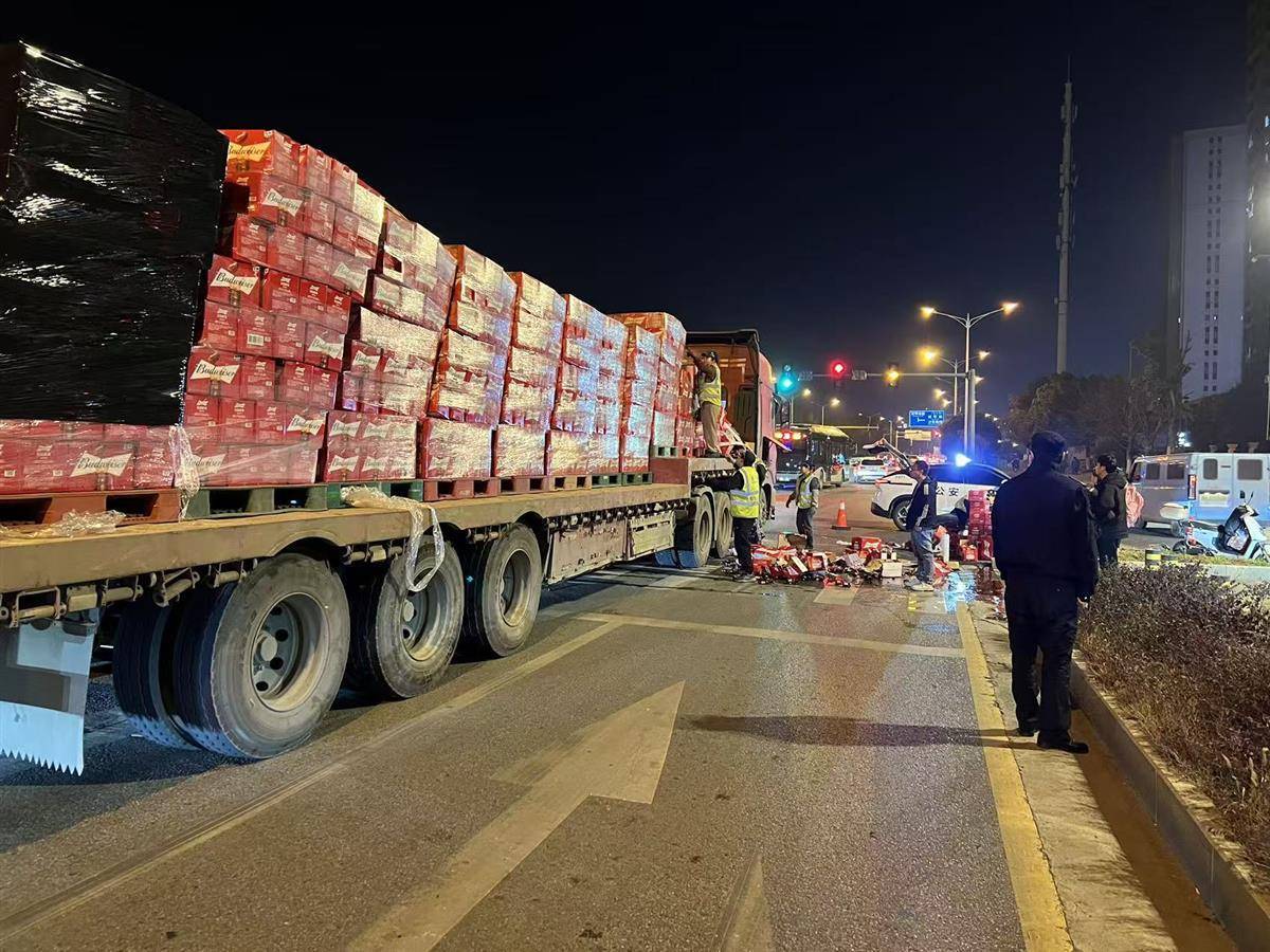 湖北日报讯(记者张竞恒、通讯员严娟娟、沈黎)1月15日晚7时40分,夜色渐深,武汉市蔡甸区新天大道上车流如织。在中法生态示范城第一初级中学红绿灯处,一场突发状况打破了夜晚的平静:一辆满载啤酒的货车因紧急刹车,车上百余箱啤酒瞬间散落一地,玻璃碎片与酒液四处飞溅,道路迅速陷入拥堵。