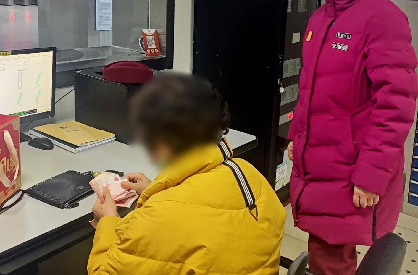 王嫚和行车值班员石荟芸进行仔细清点,确认包内装有现金10300元,另有银行卡、蛋糕券等物品。为尽快找到失主,王嫚调取卫生间周边区域的监控录像,快速锁定失主特征——一名身着黄色羽绒服、留着卷发的女乘客。她继续通过多个监控查询,乘客朱女士上完洗手间后,乘坐开往沌阳大道站方向的列车离开。此时,列车正驶向龙阳村站。