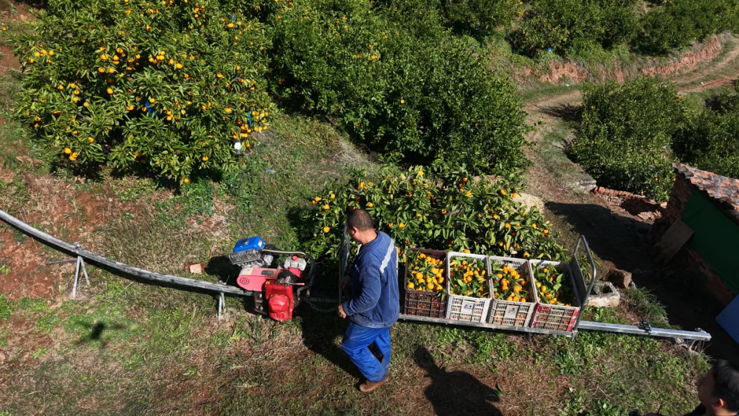 第一代橘农修通了公路,解决了“运不出去”的难题。但从陡峭的果园到路边的“最后一公里”,依然要靠“一条扁担、两条腿”。这份沉重的负担,如今有了新的答案。