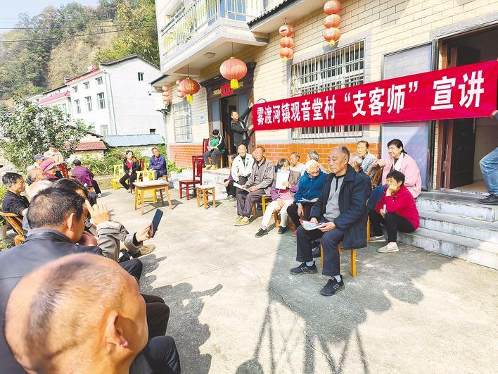 地处三峡腹地的夷陵区立足地域文化特色,经过摸底筛选、层层推荐,组建了一支政治觉悟高、表达能力强、群众基础好的支客师基层志愿服务宣讲队。他们将宣讲课堂搬到婚丧嫁娶现场、节庆聚会席间、田间地头上,用乡音土语解读政策精神,用身边案例诠释“三大精神”。
