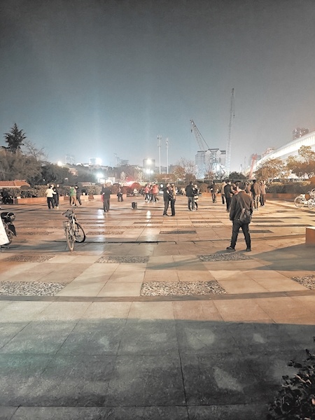 1月14日晚7时30分许,极目新闻记者来到青山区友谊大道与园林路交会处的钢都花园露天广场。此时,附近的钢都中学教学楼灯火通明,而广场内开始热闹起来——圆形小广场中央,音响设备已经摆放到位,多位准备跳广场舞的市民正在热身,更多市民陆续赶来加入。