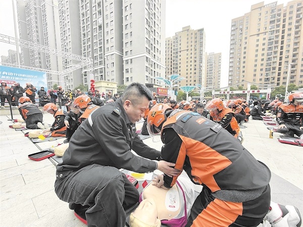 外卖骑手在专业人士指导下接受心肺复苏培训 通讯员供图