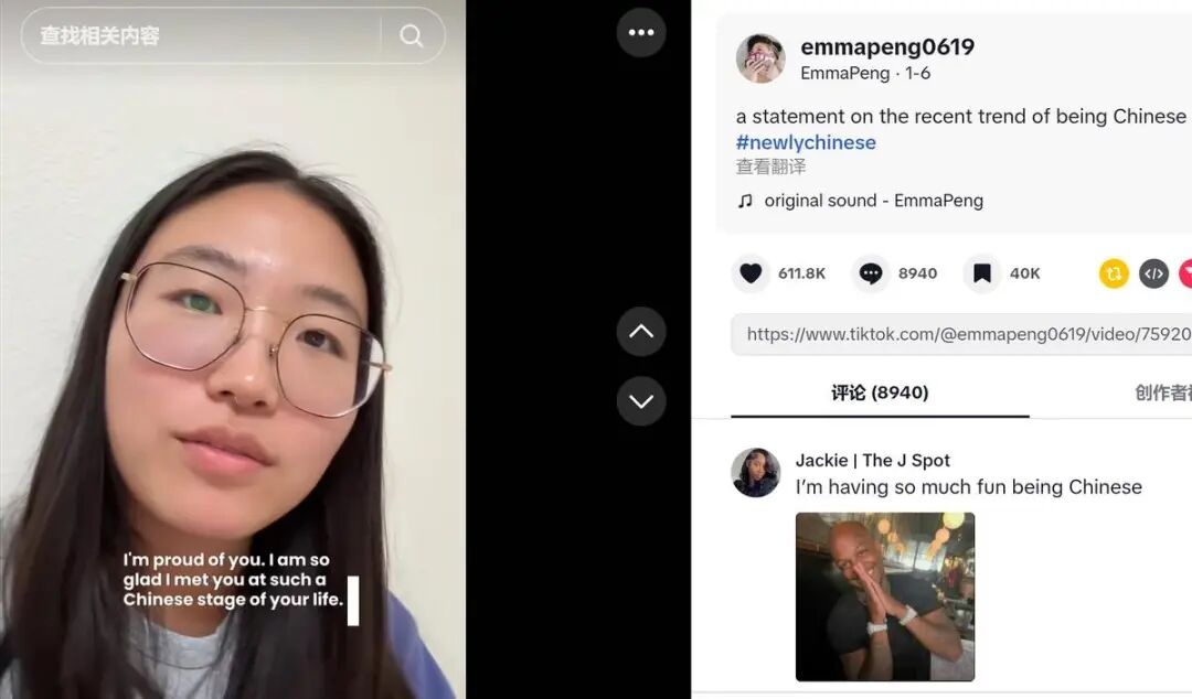 另一位华裔博主@emmapeng0619模仿《搏击俱乐部》经典台词发视频说,“很高兴在你人生这么‘中国’的阶段遇见你。”这个句式随后成为热门话题,吸引了更多网友加入这场跨文化体验。