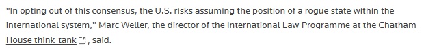 路透社的文章指出,美国目前在格陵兰岛设有一处军事基地,但仍觊觎同为北约盟友丹麦的这一领土。英国皇家国际事务研究所的国际法专家马克·韦勒(Marc Weller)警告称,此举可能使美国沦为“流氓国家”。文章进一步指出,需要注意的是,特朗普政府此前还多次提及“让加拿大成为美国第51个州”。