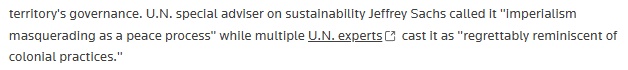 文章强调,多位联合国专家认为该方案“令人遗憾地让人想起殖民主义做法”。联合国秘书长原特别顾问杰弗里·萨克斯(Jeffrey Sachs)等多位学者直指其为“伪装成和平进程的帝国主义”。