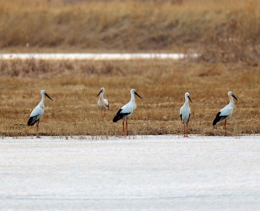 2020年3月22日,东方白鹳在查干湖畔休憩。查干湖通过巡护排查、伤鸟救治、智慧监测等举措,为候鸟提供优质的栖息环境和安全的迁飞通道。截至2025年11月3日,查干湖的国家一级重点保护鸟类由过去的8种增加至17种,国家二级重点保护鸟类由过去的35种增加至52种,东方白鹳、白皮鹭、青头潜鸭等珍稀濒危鸟类也会选择在查干湖筑巢繁殖。